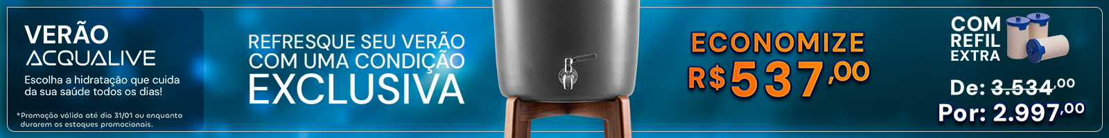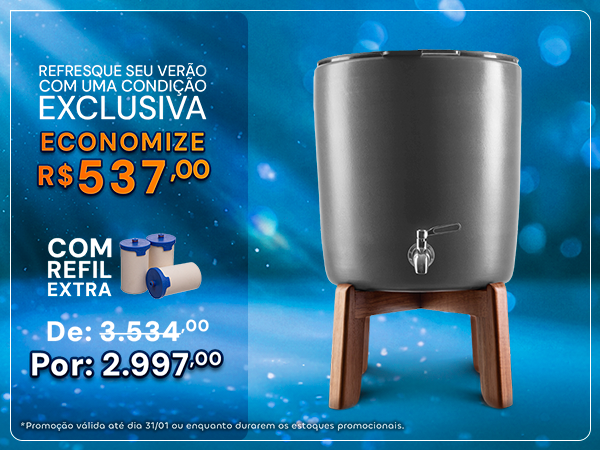 Produto mais desejado da marca, com design vintage e estilo retrô, o Purificador de Água Terracota combina com todas as decorações, é a verdadeira evolução dos filtros de barro, aliando tradição e tecnologia exclusiva. Um purificador que deixa a água pura, alcalina, rica em magnésio, livre de cloro e perfeita para a saúde e vai ficar perfeito na sua casa.