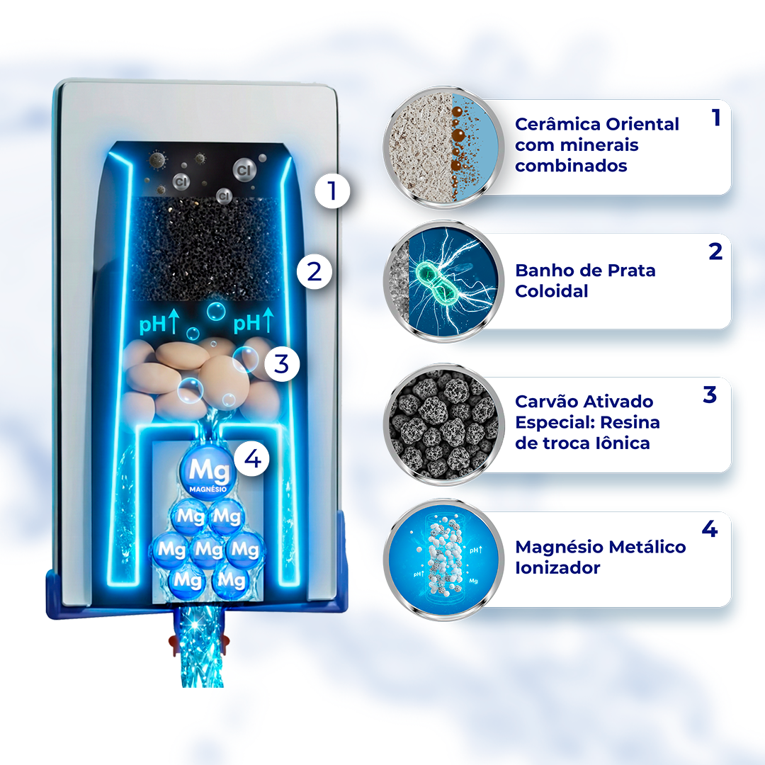A água alcalina é a ideal para a saúde. Enquanto a água comum tem pH neutro (em torno de 7), a alcalina tem pH entre 8 e 10, o que ajuda a neutralizar o excesso de acidez do nosso corpo — algo que vem de dietas ruins, estresse e poluição.