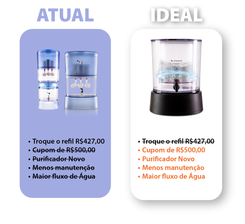 Valorizamos sua fidelidade: Seu filtro antigo vale DESCONTOS que podem fazer um novíssimo Acqualive sair por menos de R$1000,00 para você fazer o upgrade agora para os mais modernos Purificadores e Ionizadores.
