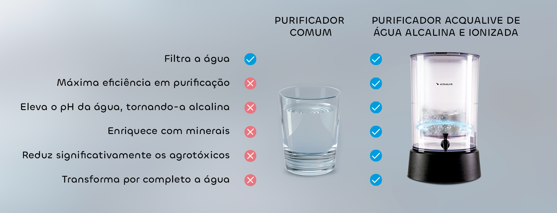 Comparativo entre Purificador comum e Purificador Acqualive de água alcalina e ionizada