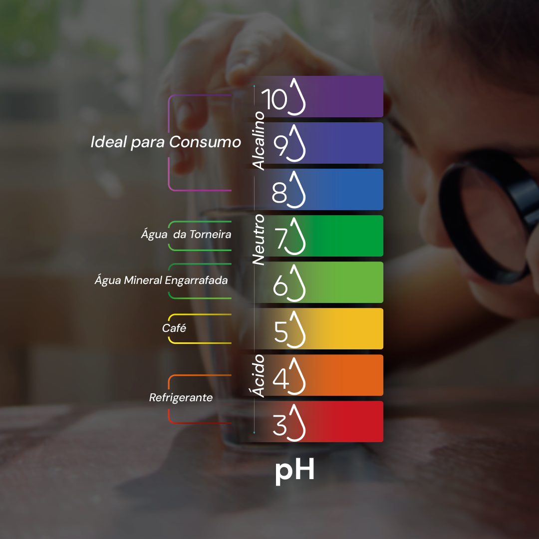 A água alcalina é a ideal para a saúde. Enquanto a água comum tem pH neutro (em torno de 7), a alcalina tem pH entre 8 e 10, o que ajuda a neutralizar o excesso de acidez do nosso corpo — algo que vem de dietas ruins, estresse e poluição.