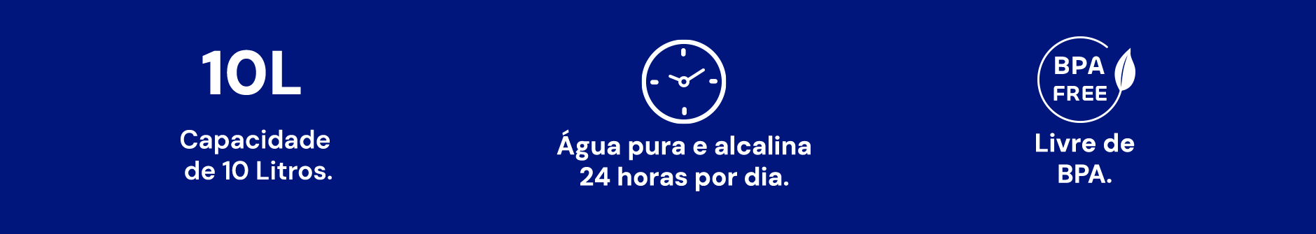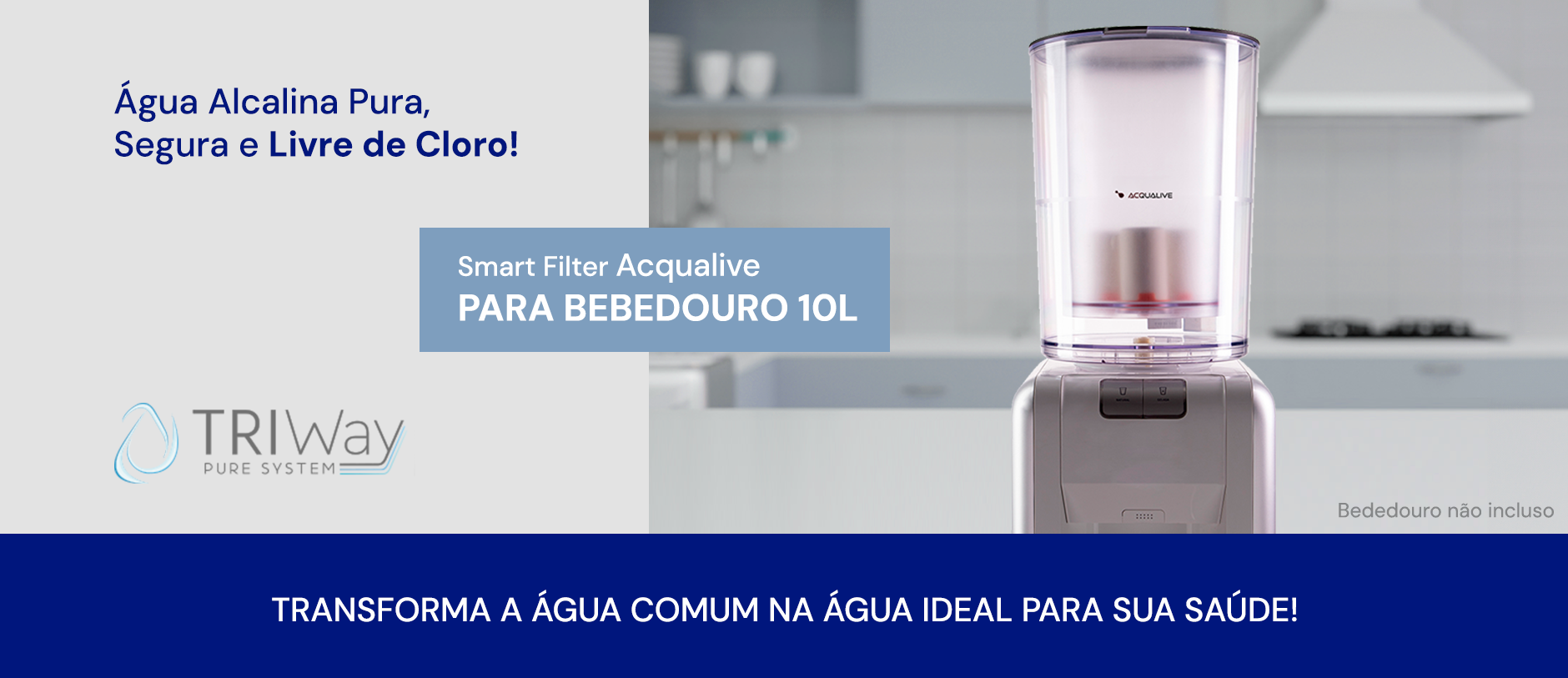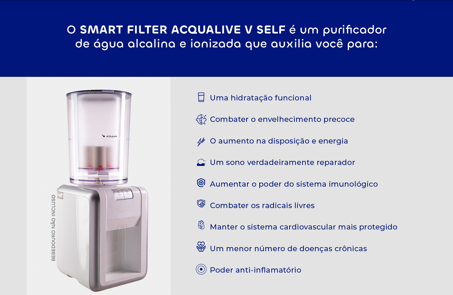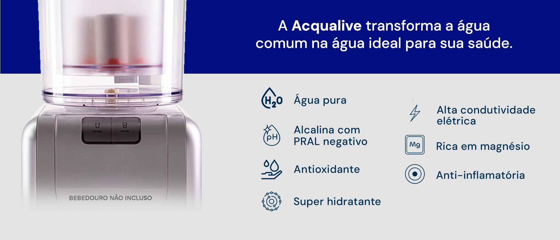 Com o Purificador de Água Acqualive V10 você tem um filtro de água purificador capaz de transformar a água comum em uma água pura. alcalina. rica em magnésio. livre de cloro e com poder alcalinizante. Esta versão é adaptada para substituir galões e bombonas em bebedouros que gelam a água.